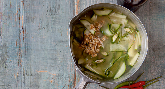 Bring the stock to the boil in a pan and reduce the heat to a good simmer. Add the lemongrass and pearl barley. Cover, leaving a bit of a gap between the lid and pan so the stock doesn’t boil over. Once the barley is tender, about 45 minutes, take the pan off the heat and remove the lemongrass. Stir in the cucumber, spring onions, chilli and tamari. Serve with fresh ginger slices scattered over.